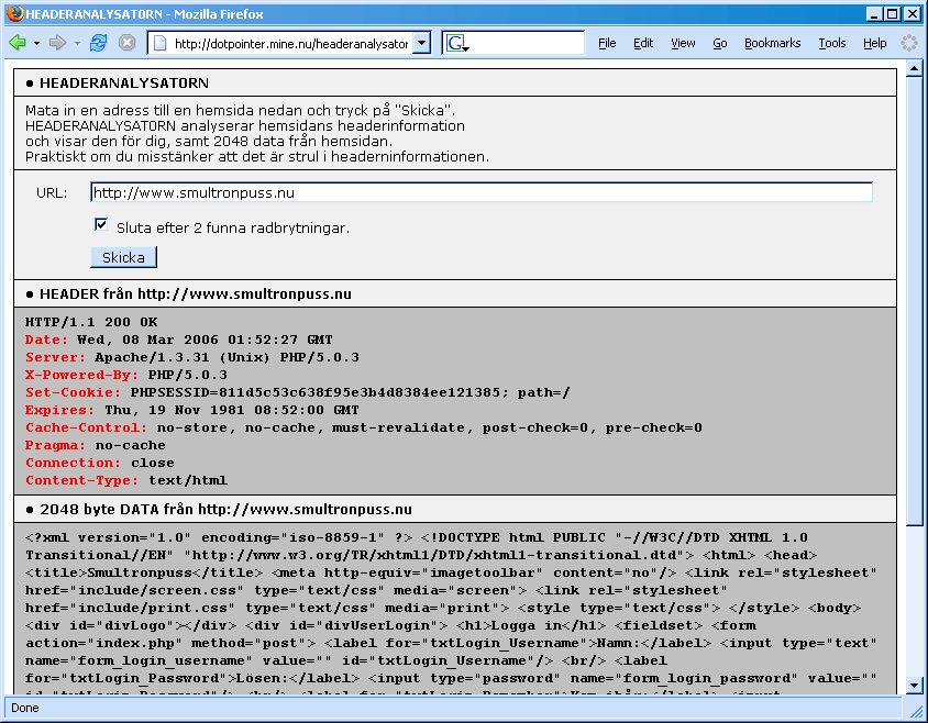 We needed control over HTTP headers in the the Napparaten project. So I invented this analyzer. It shows what the user usally does not see quickly and styled.